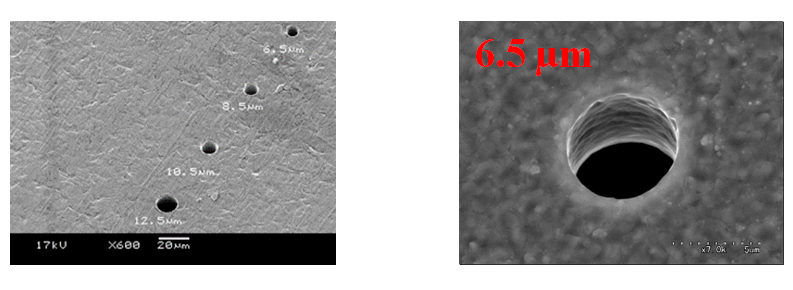 Fig. 4:Micro holes of various diameters, 6.5 µm thru holes on 50µm Stainless Steel plate. (Machine used: DT-110)