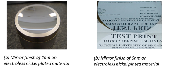 Fig. 6:Nano surface produced on electroless nickel plated dies: (a) mirror finish on a flat surface and (b) the same on an aspheric surface. (Machine used: UPL-420)