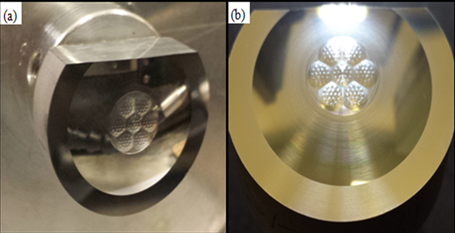Fig. 7:Photographic images of fabricated multiple compound eye surface; (a) fabricated workpiece mounted on a chuck, and (b) top slanted view. (Machine used: UPL-420)