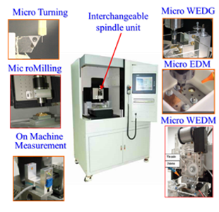 Multiple types of micro machining, e.g., micro turning, micro milling, micro EDM, micro ECM, etc. can be carried out on the same machine (Fig. 1). This highly flexible machine ensures high rigidity for precision machining.